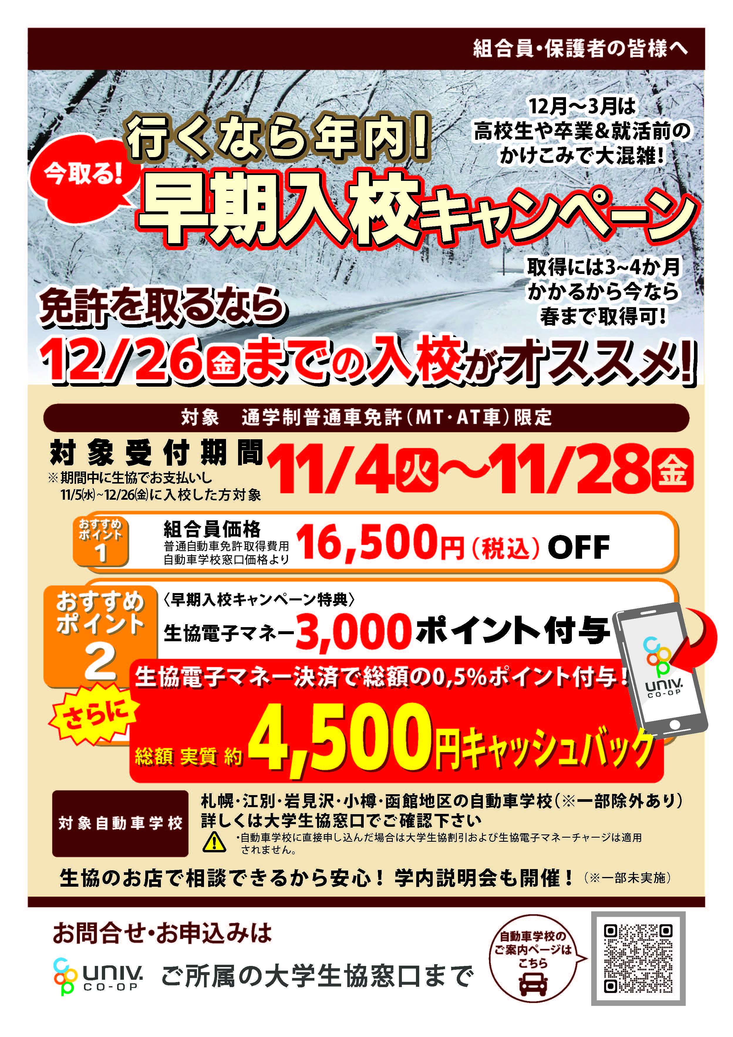 11月28日まで申し込み、12月26日まで入校がおすすめ!!